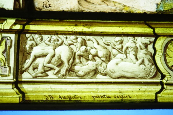 Le vitrail est signé “JB Anglade peintre verrier”, “à Condom (Gers) 1876”. Jean Baptiste Anglade (1841-1913) est un maître verrier très productif de la 2ème moitié du XIXème siècle. On peut aussi lire les initiales H G ; ce sont celles du graveur Hendrik Goltz, dont JB Anglade a copié les œuvres (pratique très courante dans le vitrail).