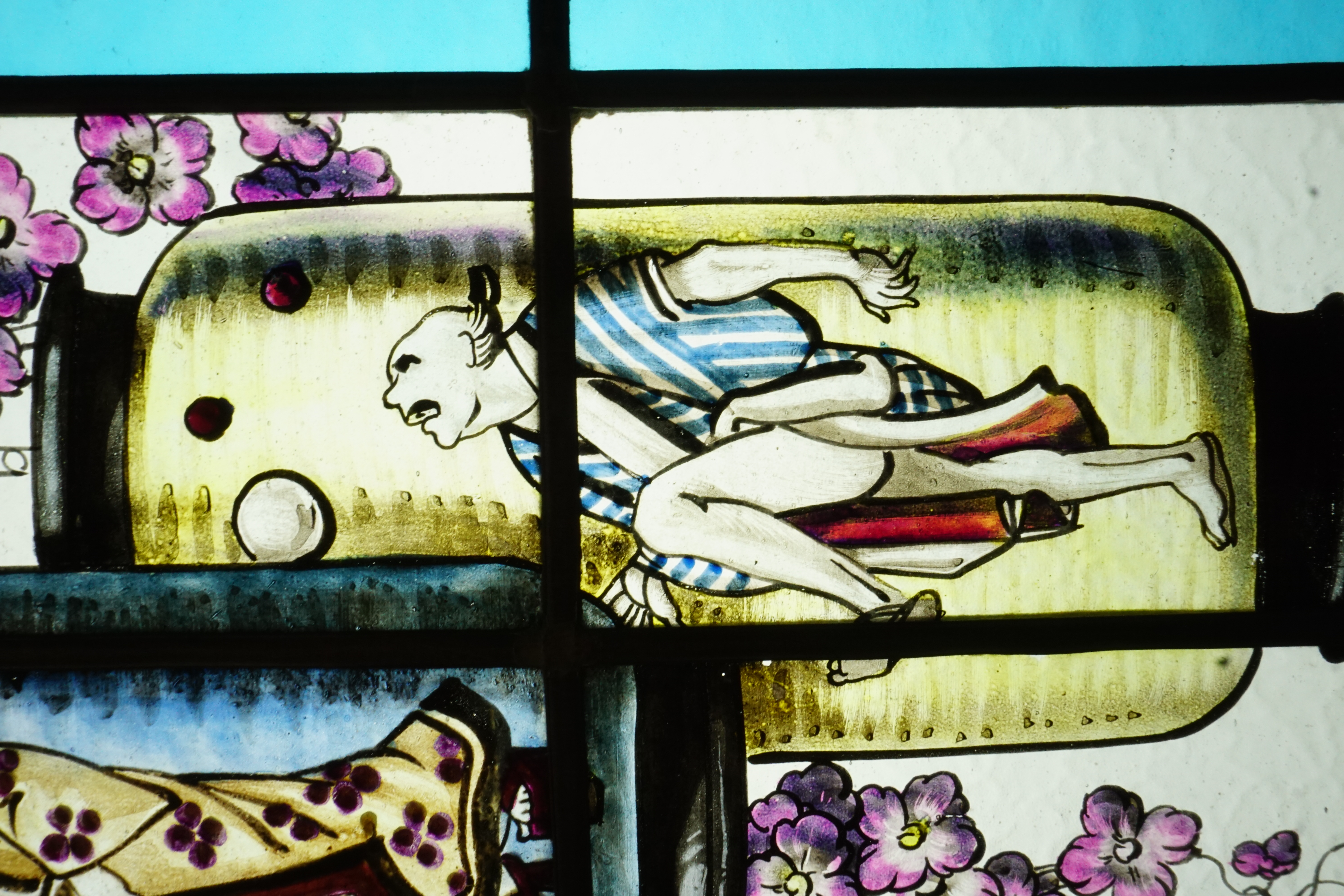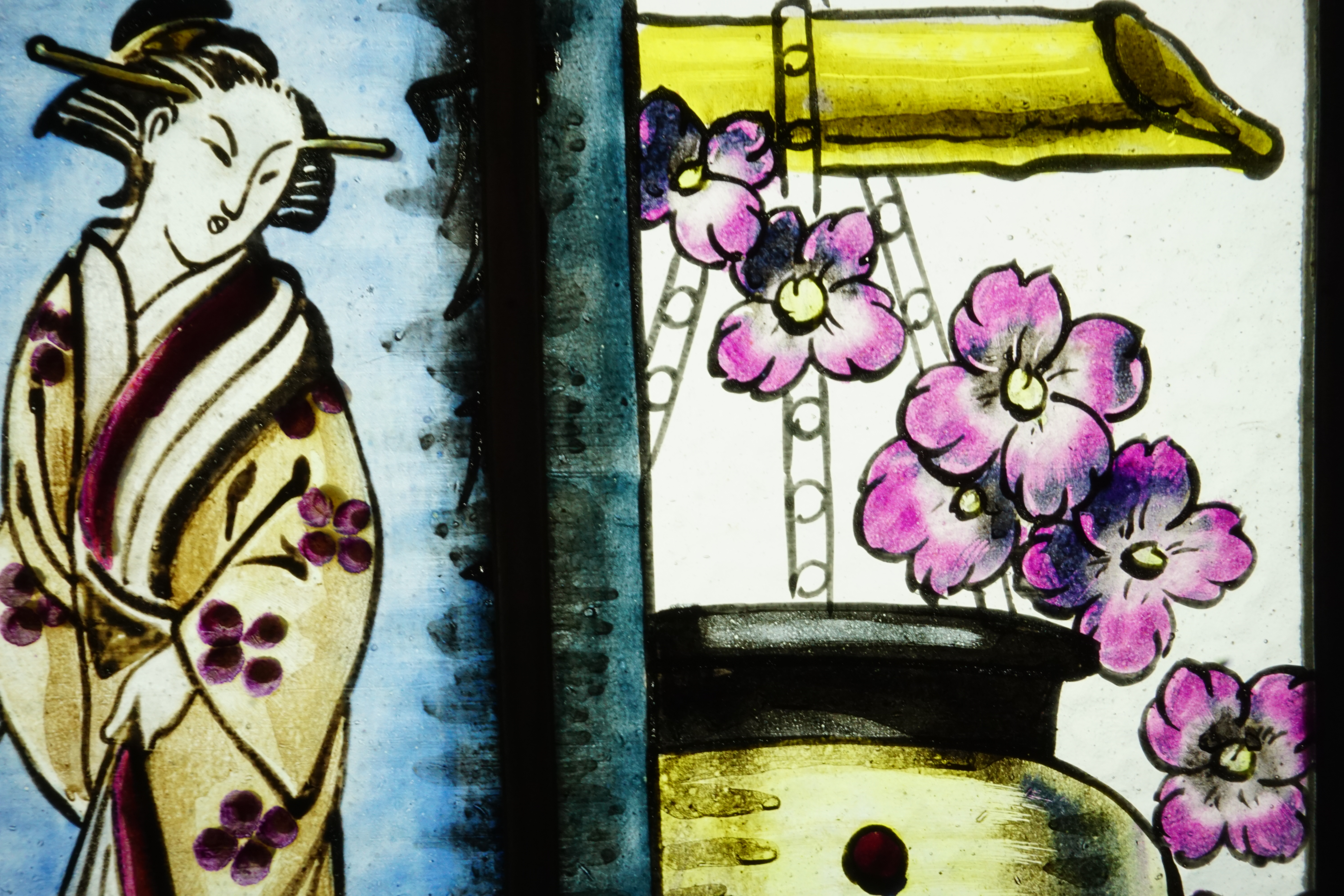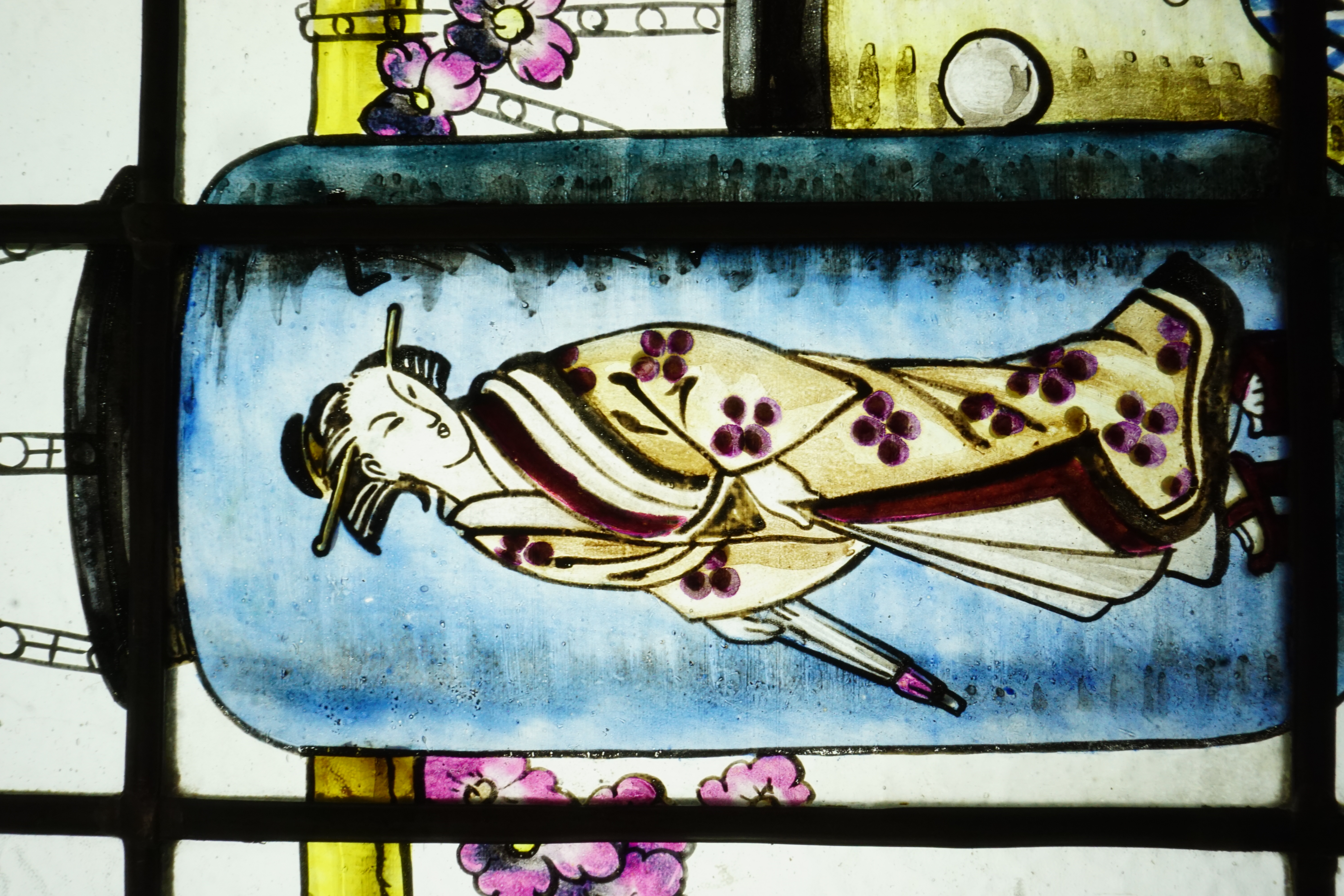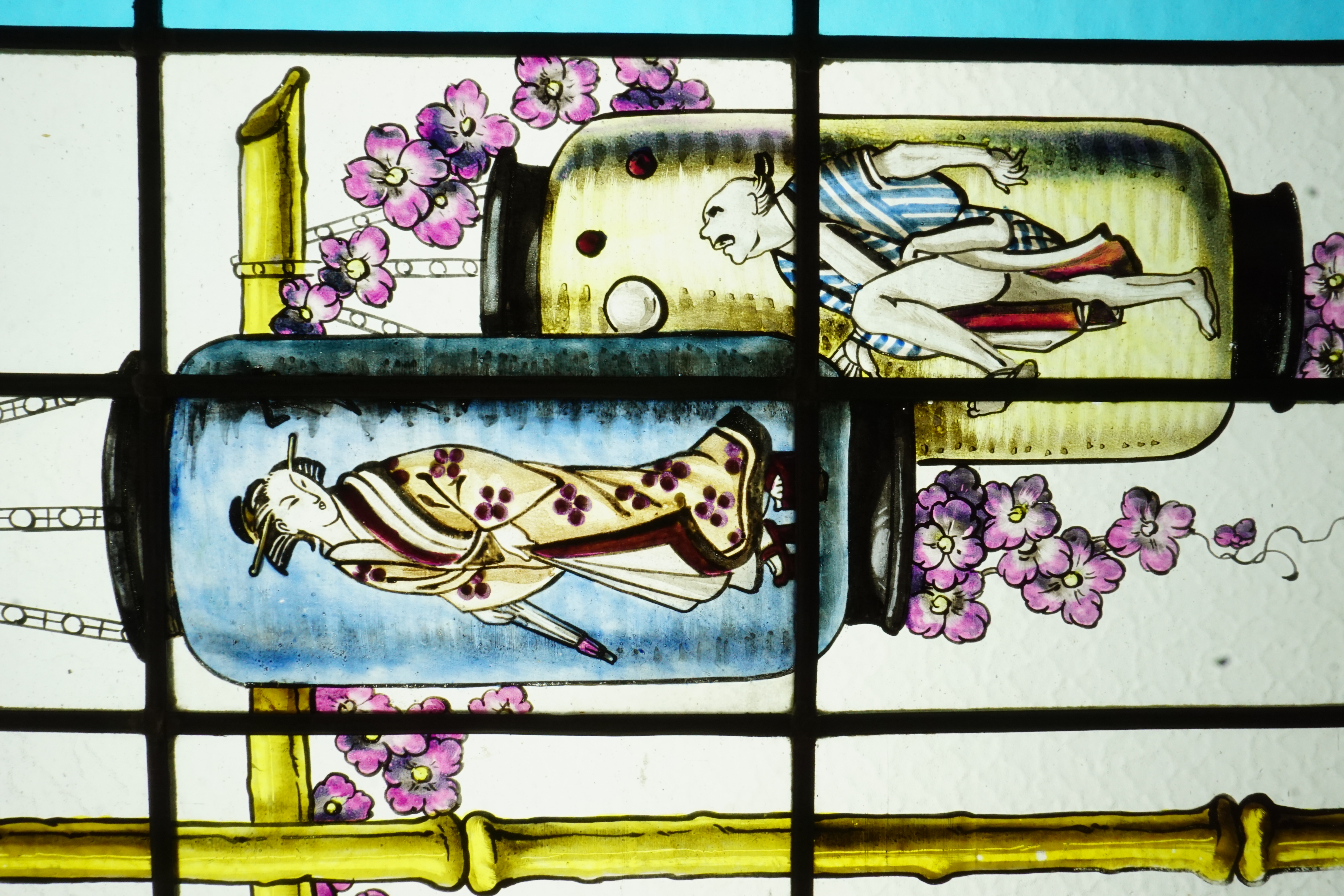 Vitrail de style japonisant, représentant des cannes de bambous sur lesquelles sont accrochés des lampions et des fleurs. Sur l’un des lampions est représentée une femme et sur l’autre un homme faisant du jonglage.