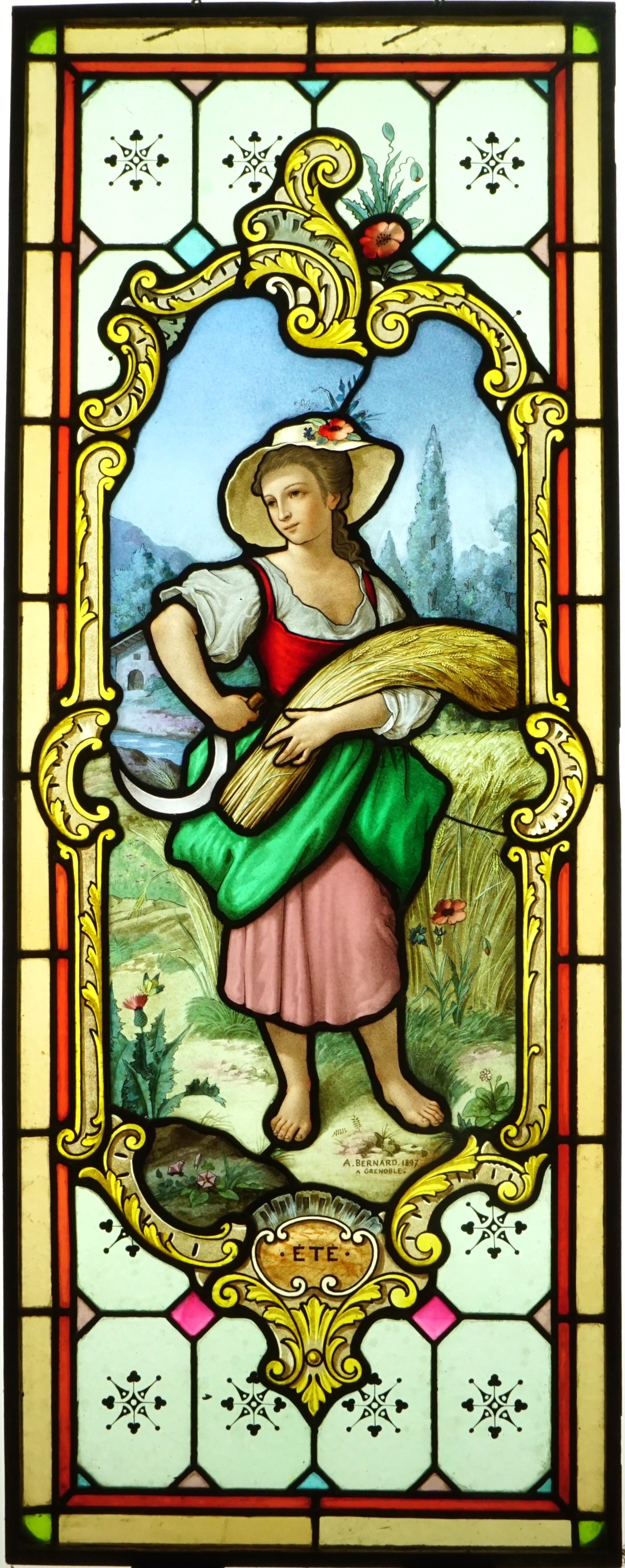 Ce vitrail en 4 panneaux représente les 4 saisons. Chacune est associée à une fleur et une activité.