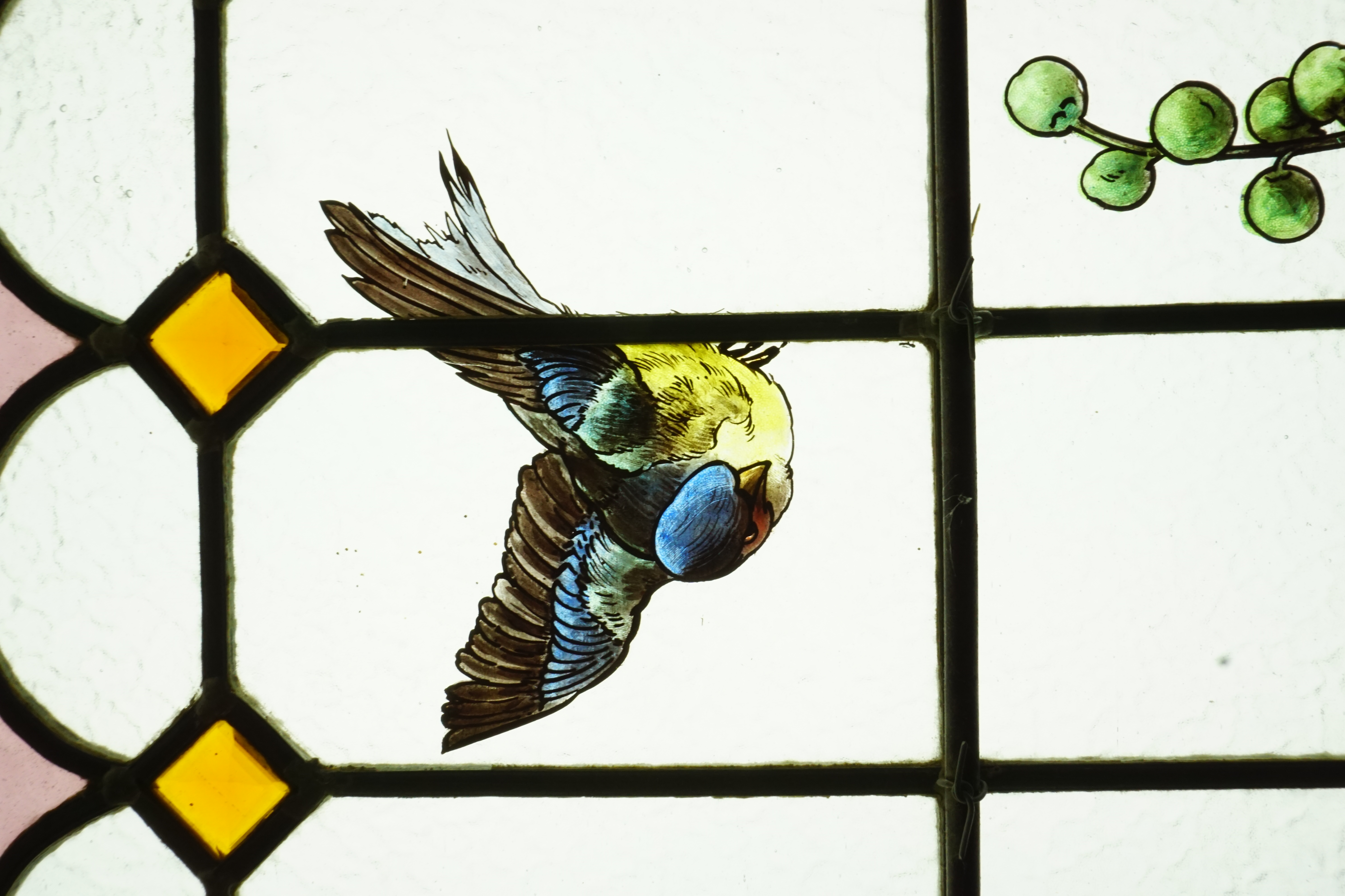 Vitrail peint à la grisaille et aux émaux de couleurs sur du verre cathédral.