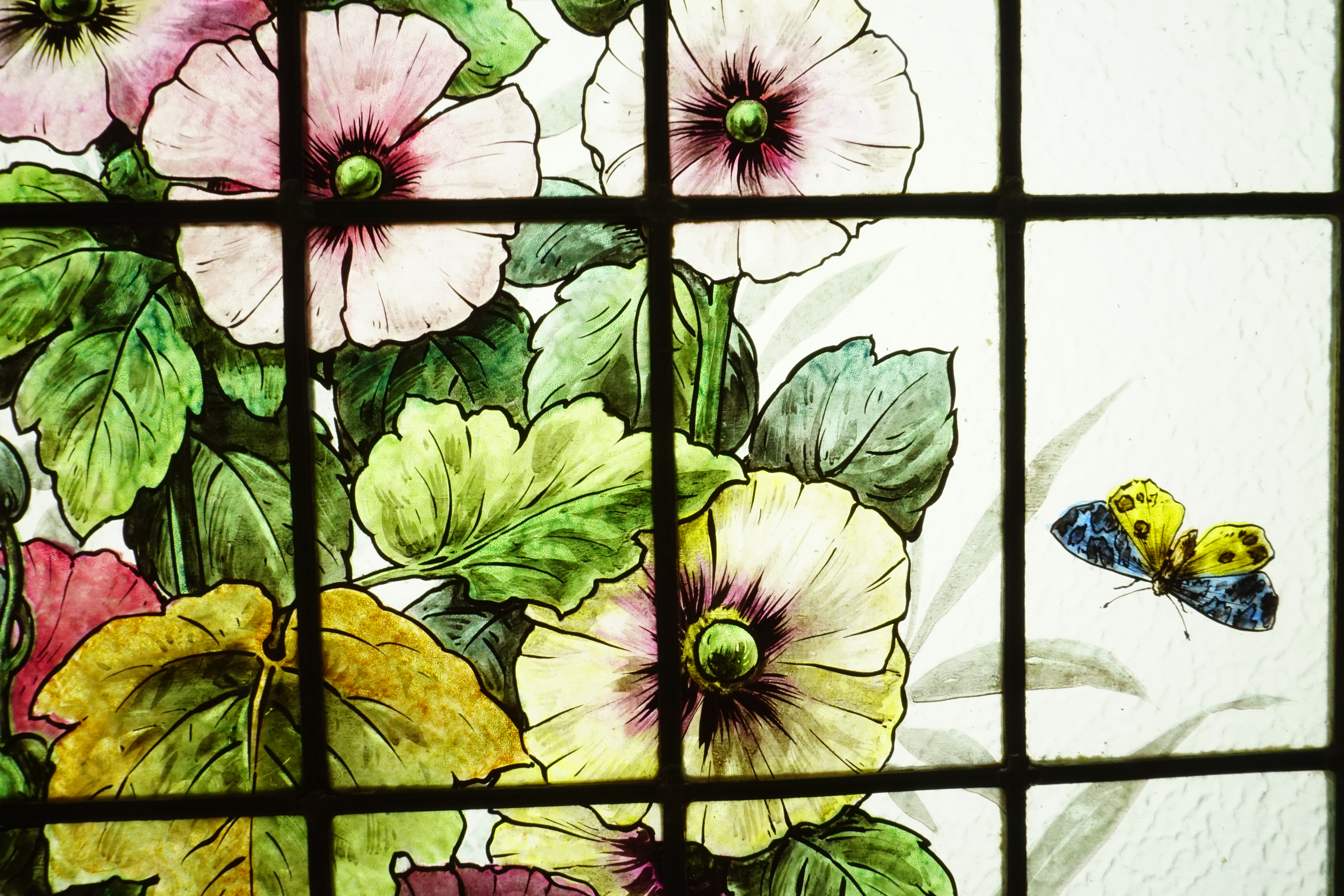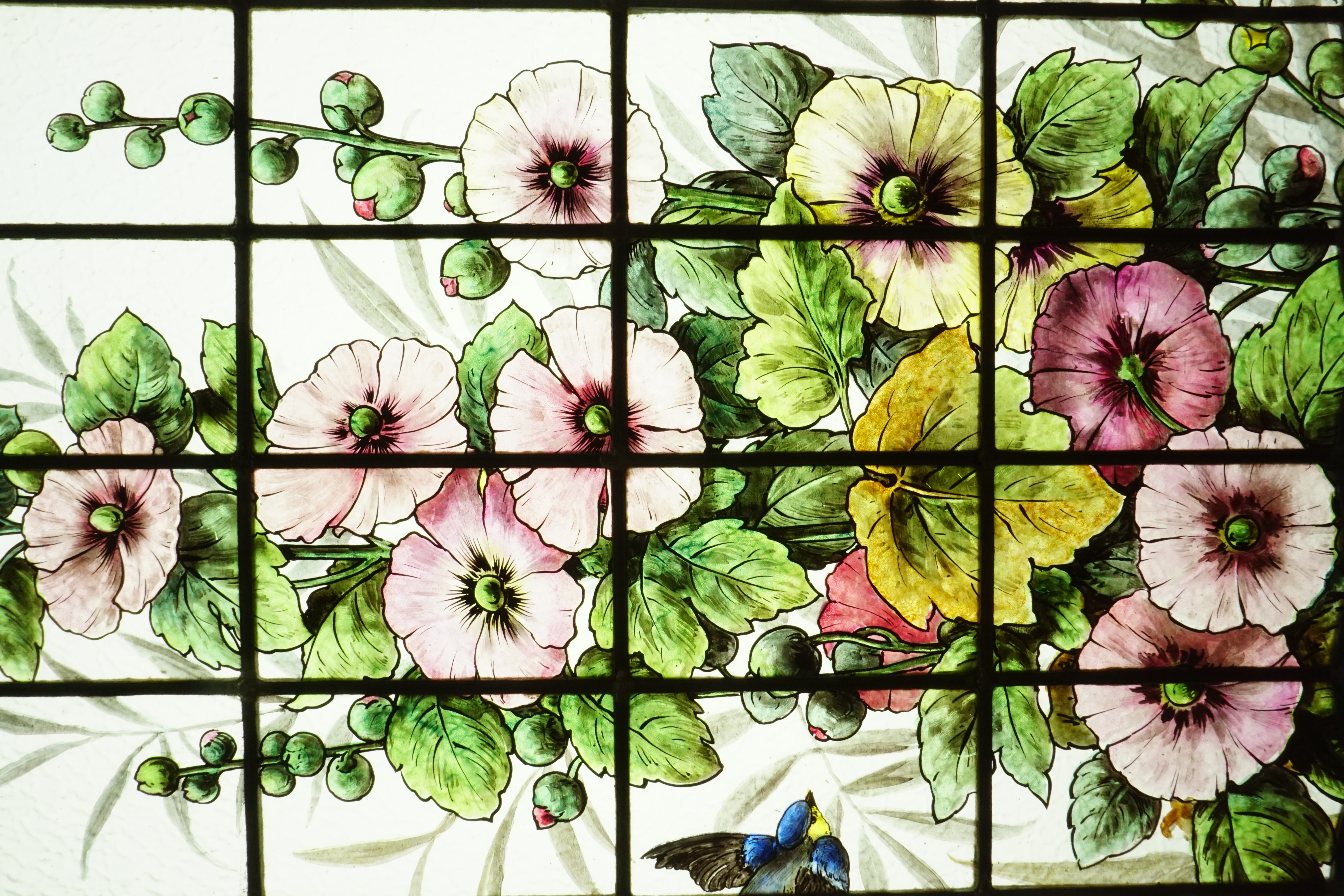 Vitrail représentant un pied de roses trémières, dans lequel volent des oiseaux et papillons.