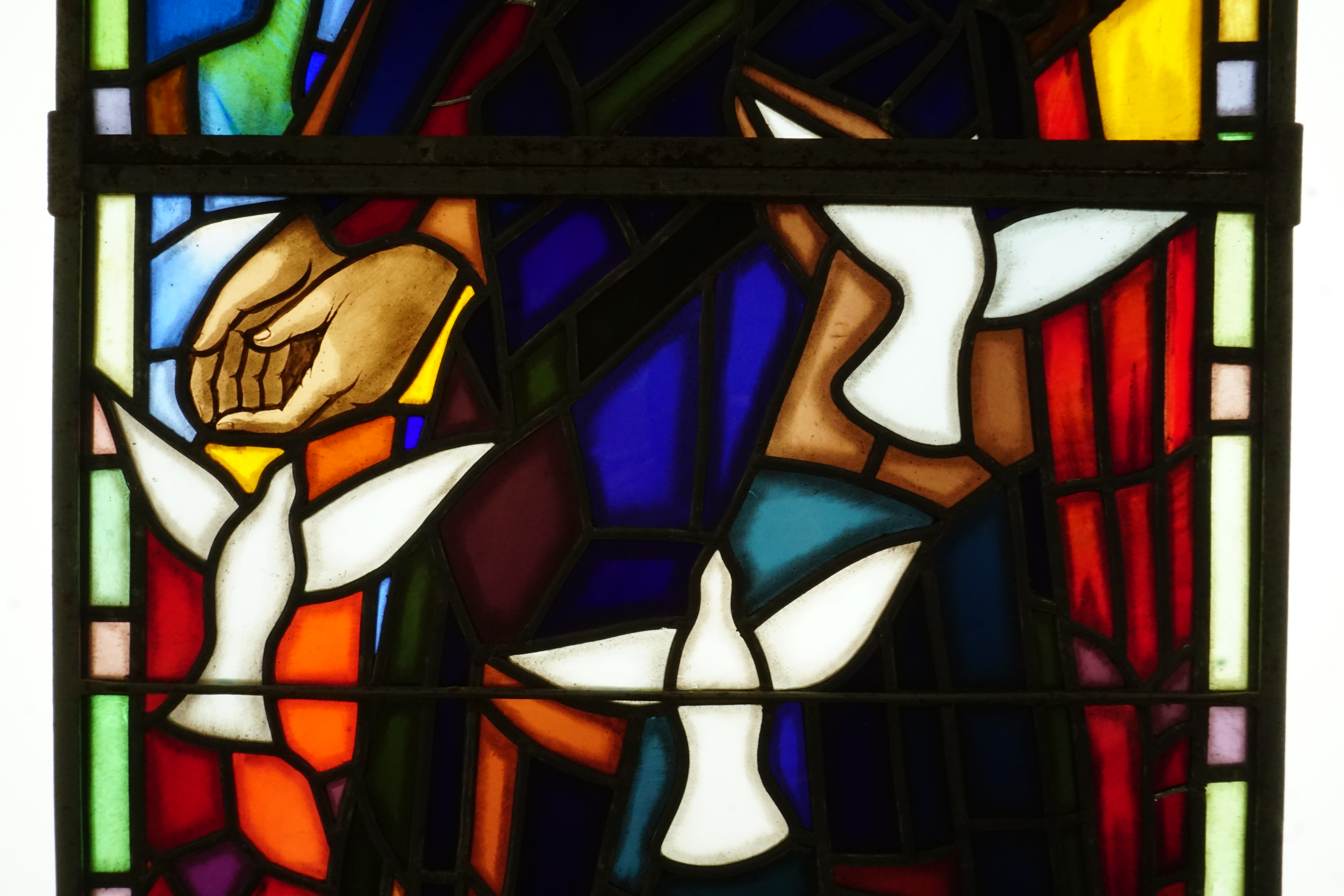 Verres de couleurs peints à la grisaille et assemblés au plomb.