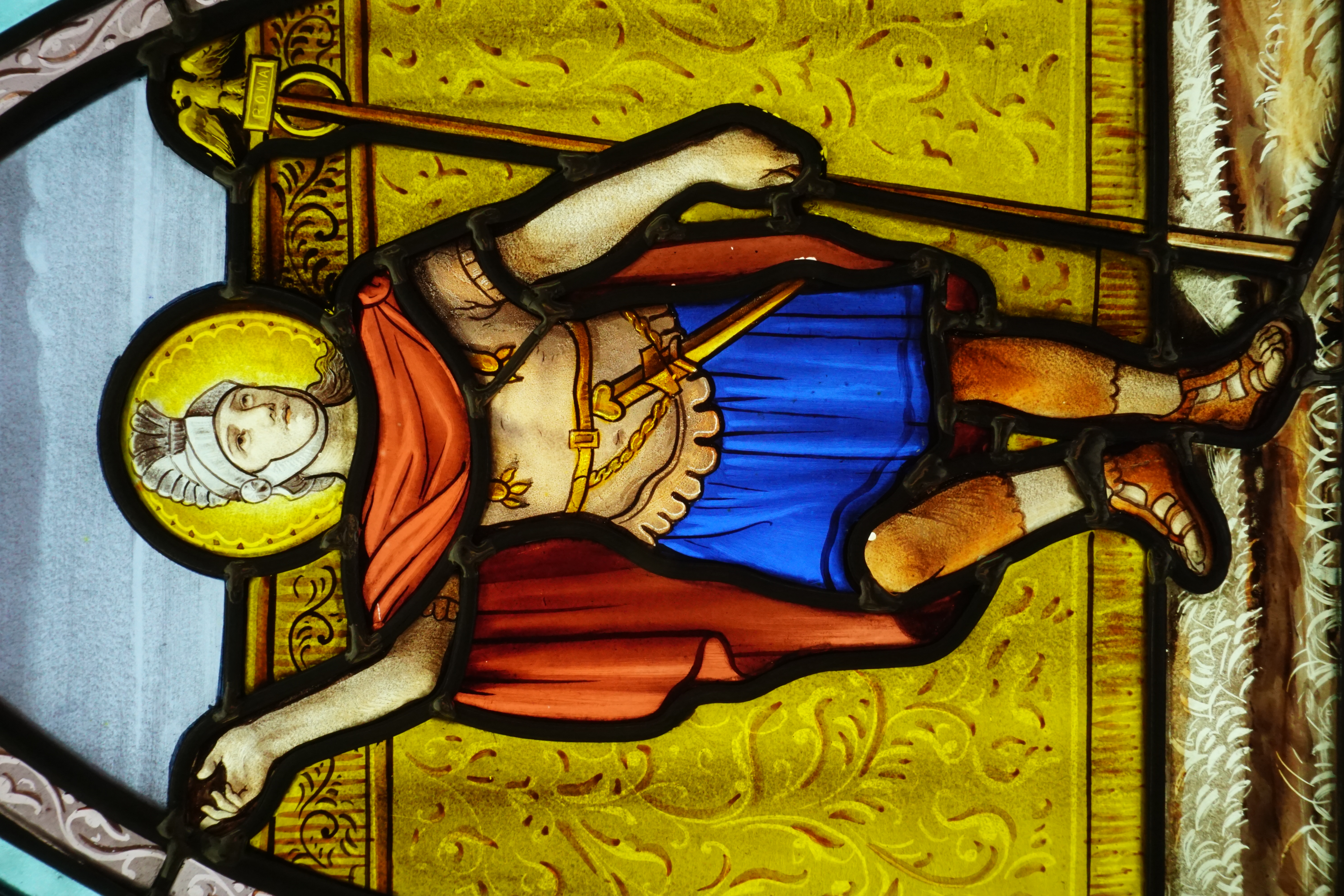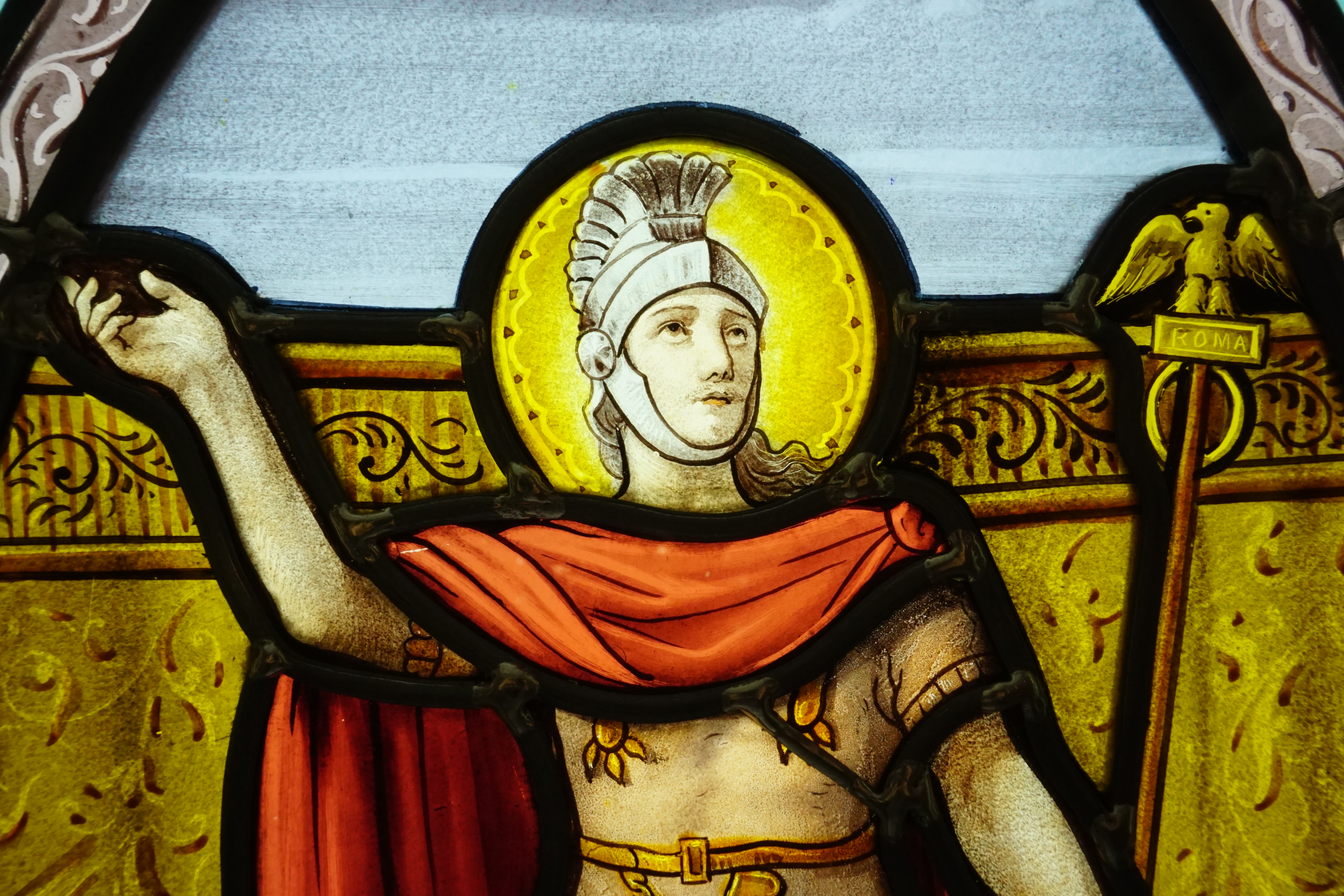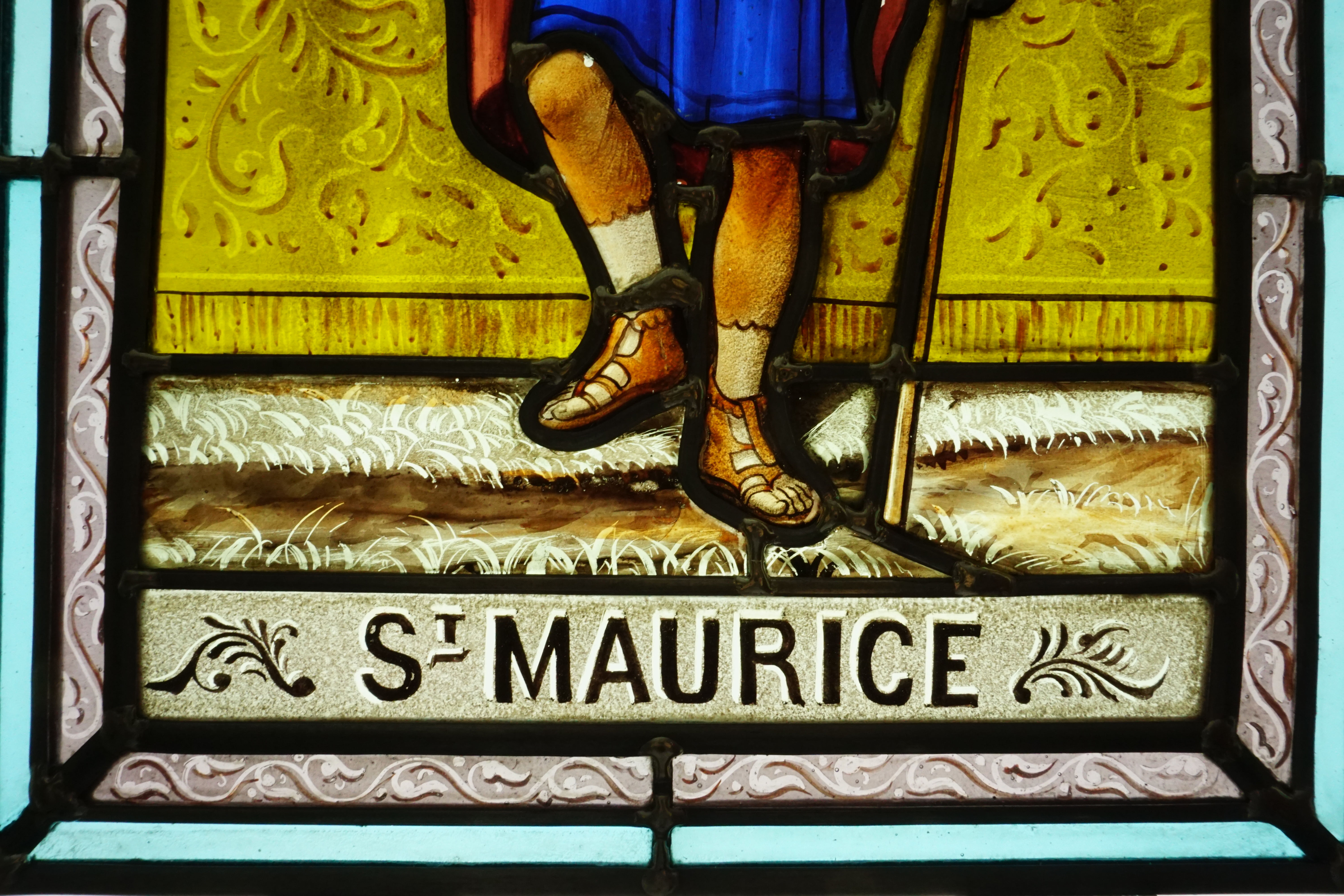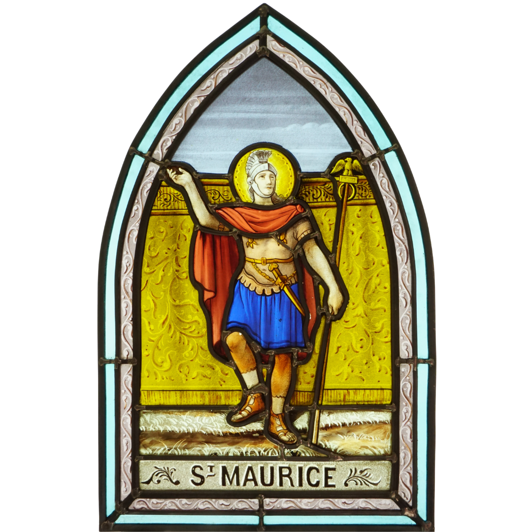 Ce vitrail représente Saint Maurice, un légionnaire venu de Thèbes, en Egypte pour combattre dans les Alpes.