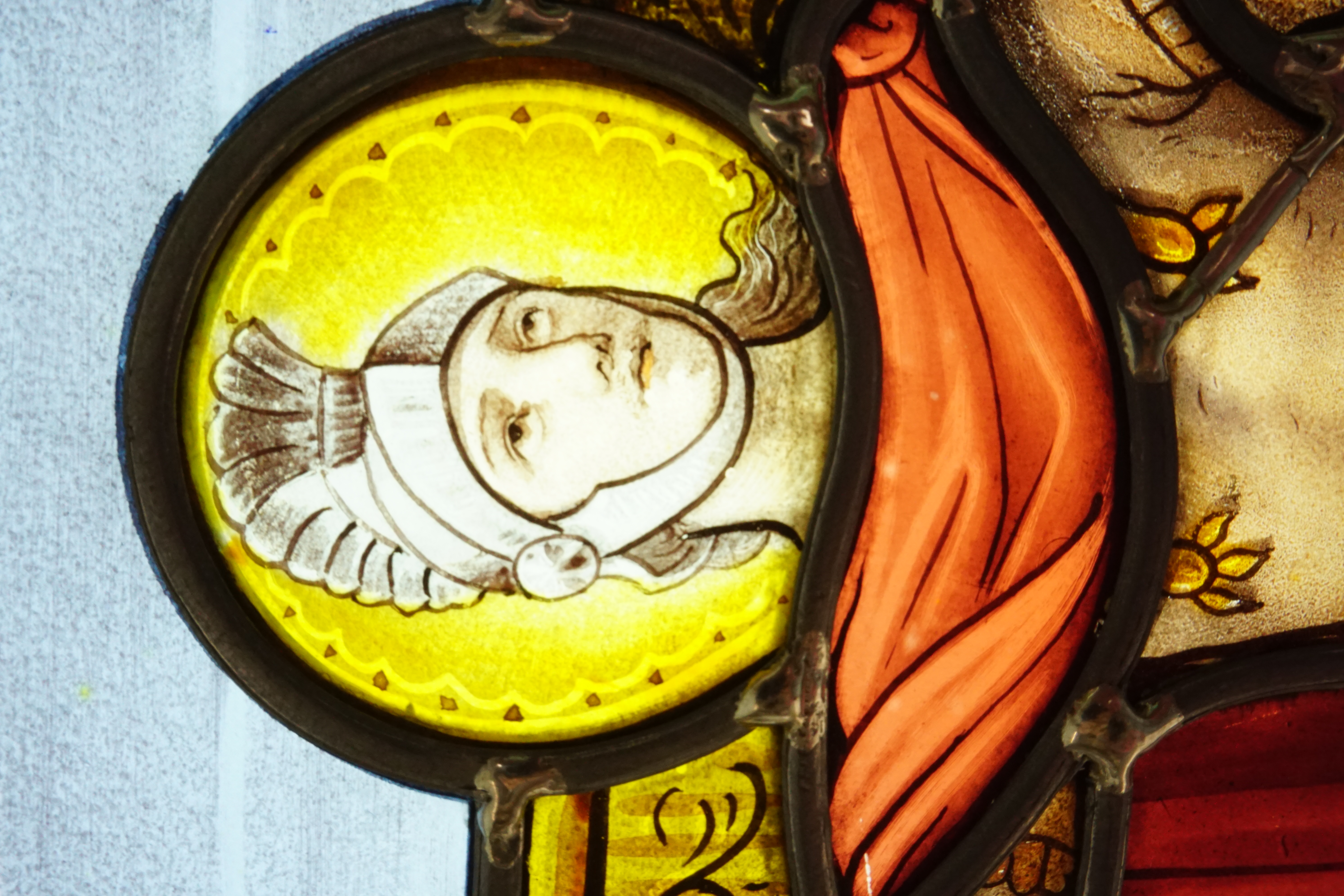 Peinture à la grisaille et au jaune d’argent sur verres de couleurs.