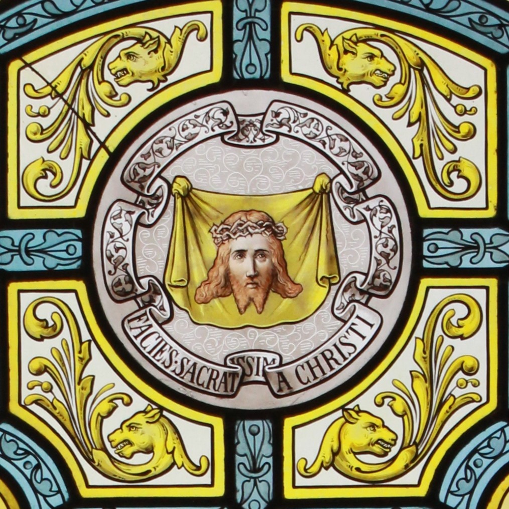 Ce vitrail représente diffèrent symbole Chrétiens. En haut, le Saint-Suaire, en dessous, l’autel, puis, le calice et enfin le chapelet.