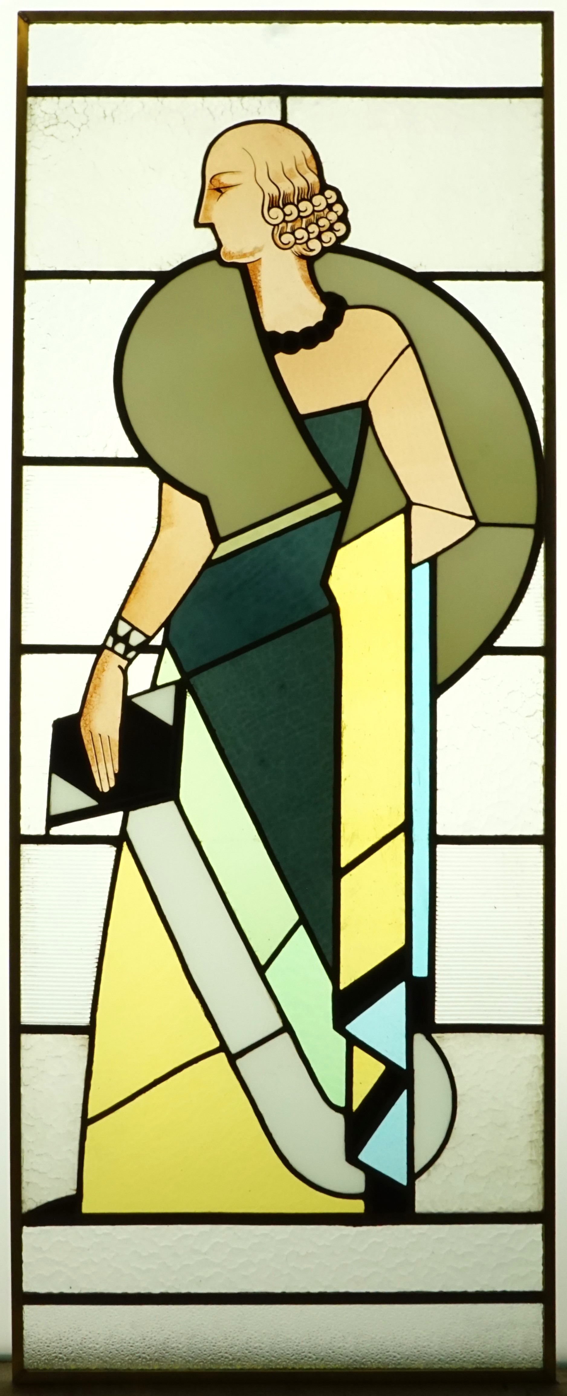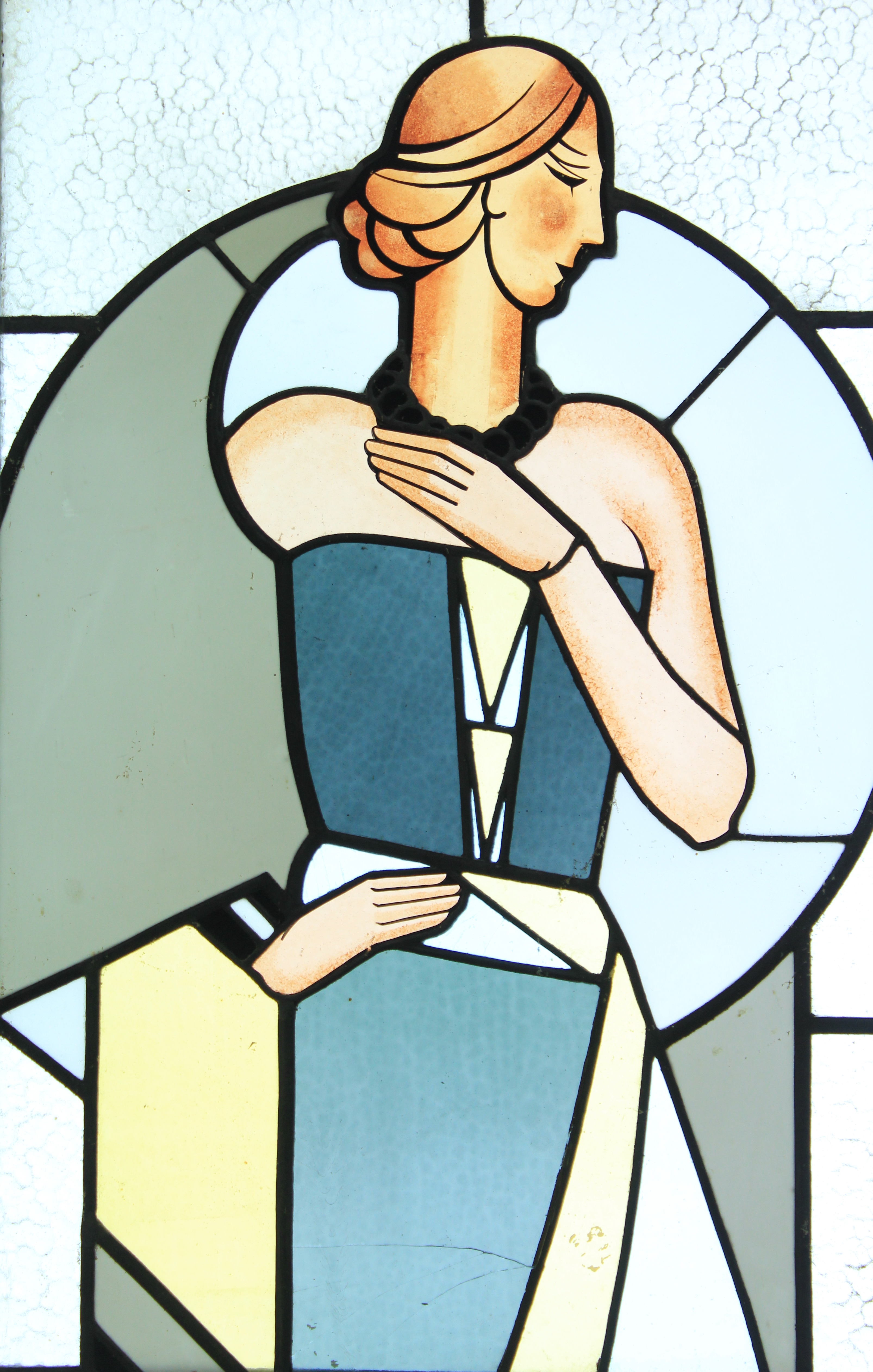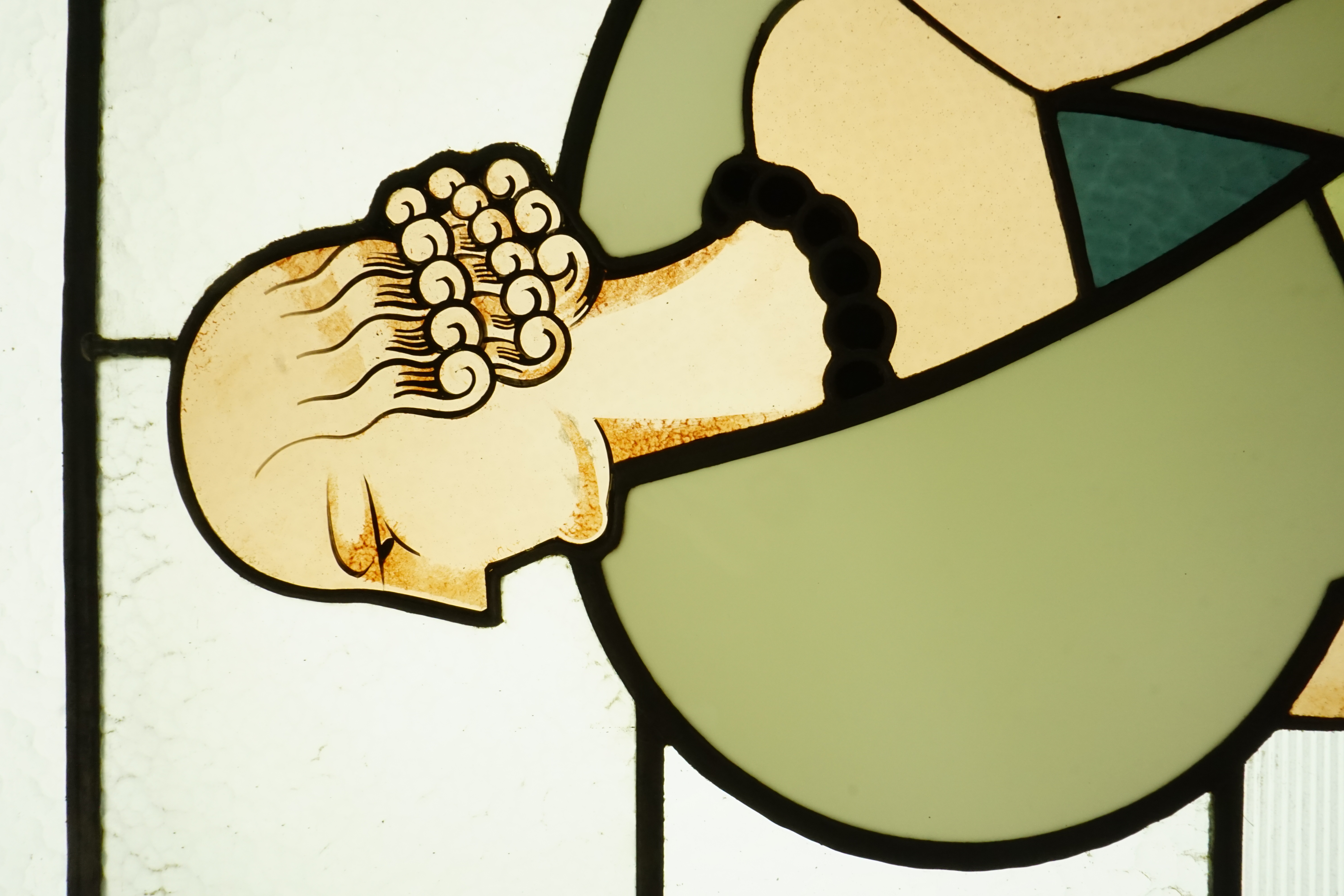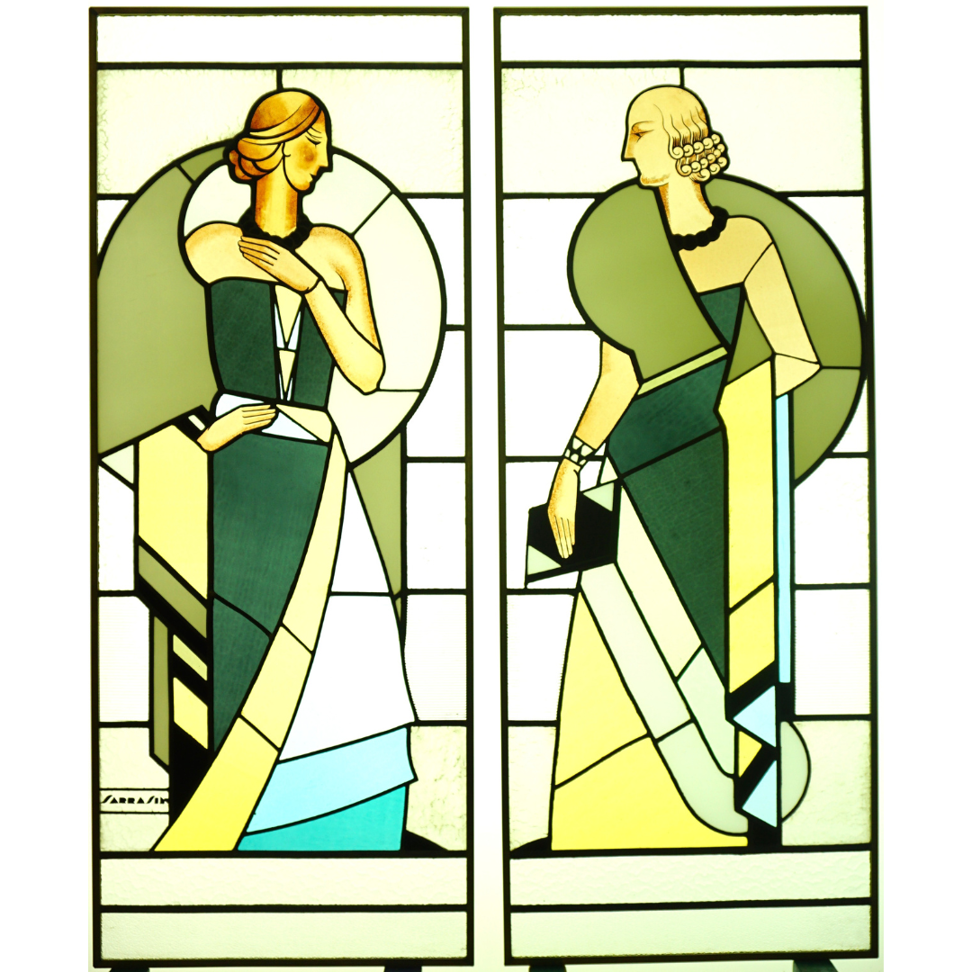 Paire de vitraux Art Déco représentant chacun une femme à la mode des années 20-30. Toutes deux portent un collier de perles et une grosse fourrure sur les épaules.