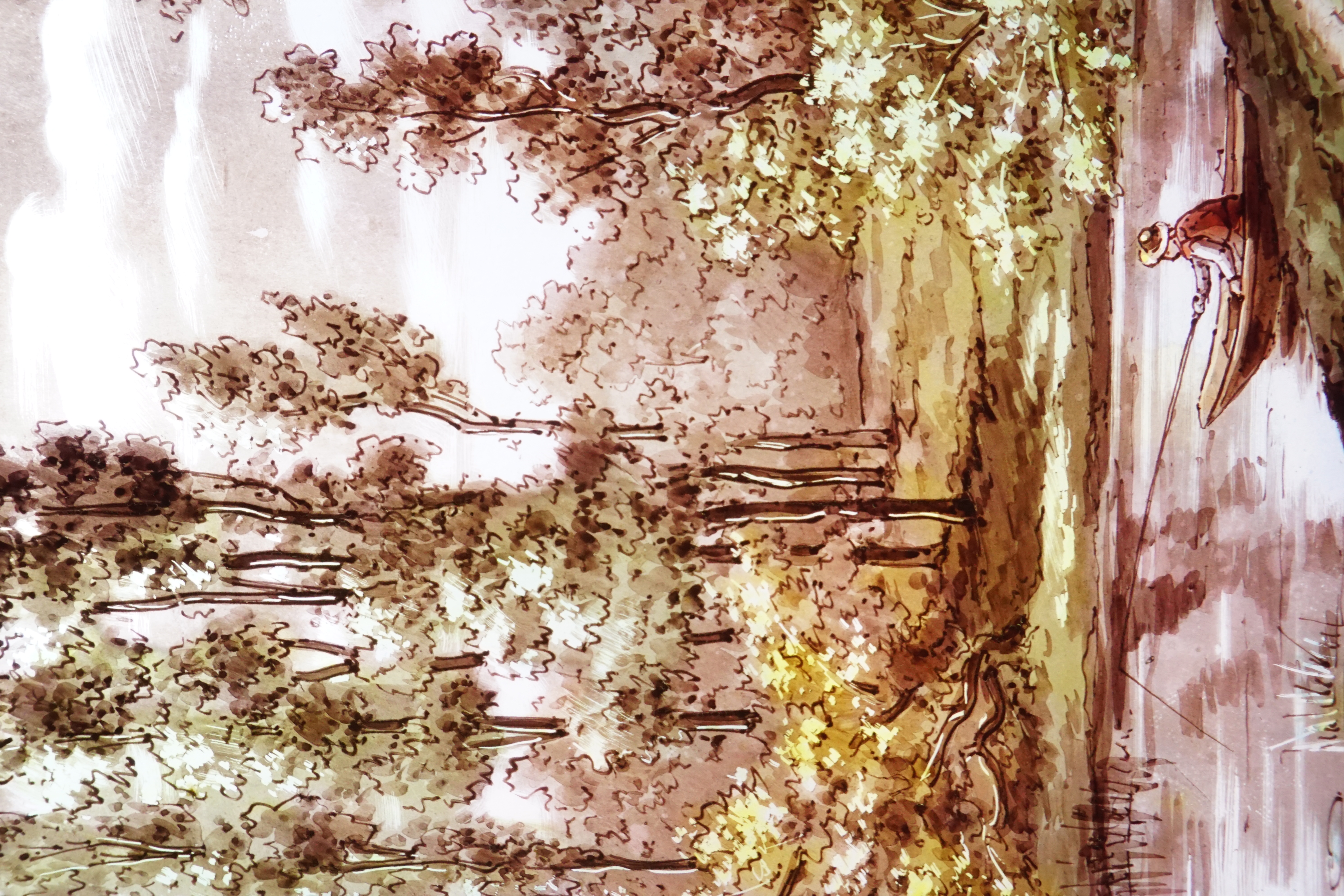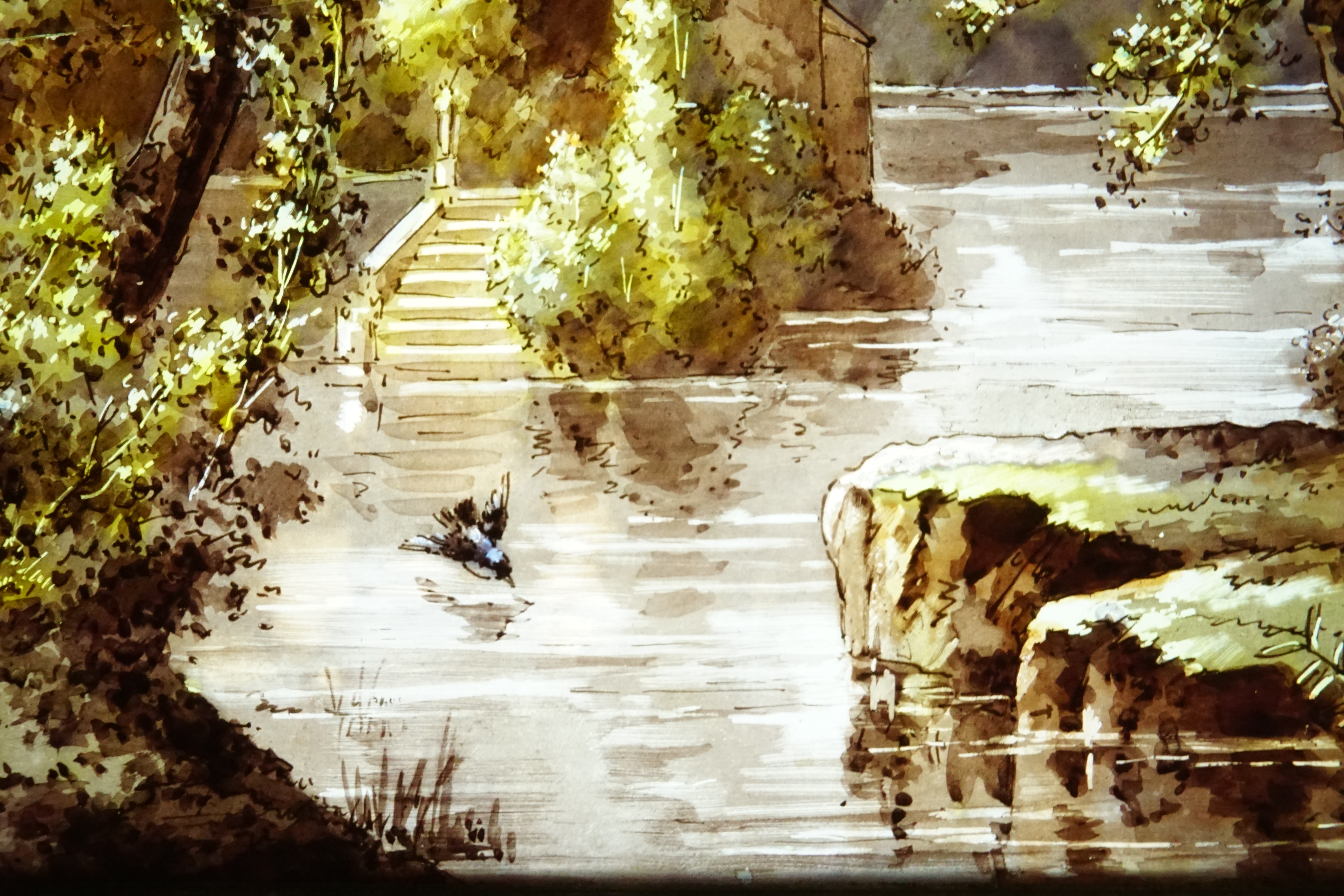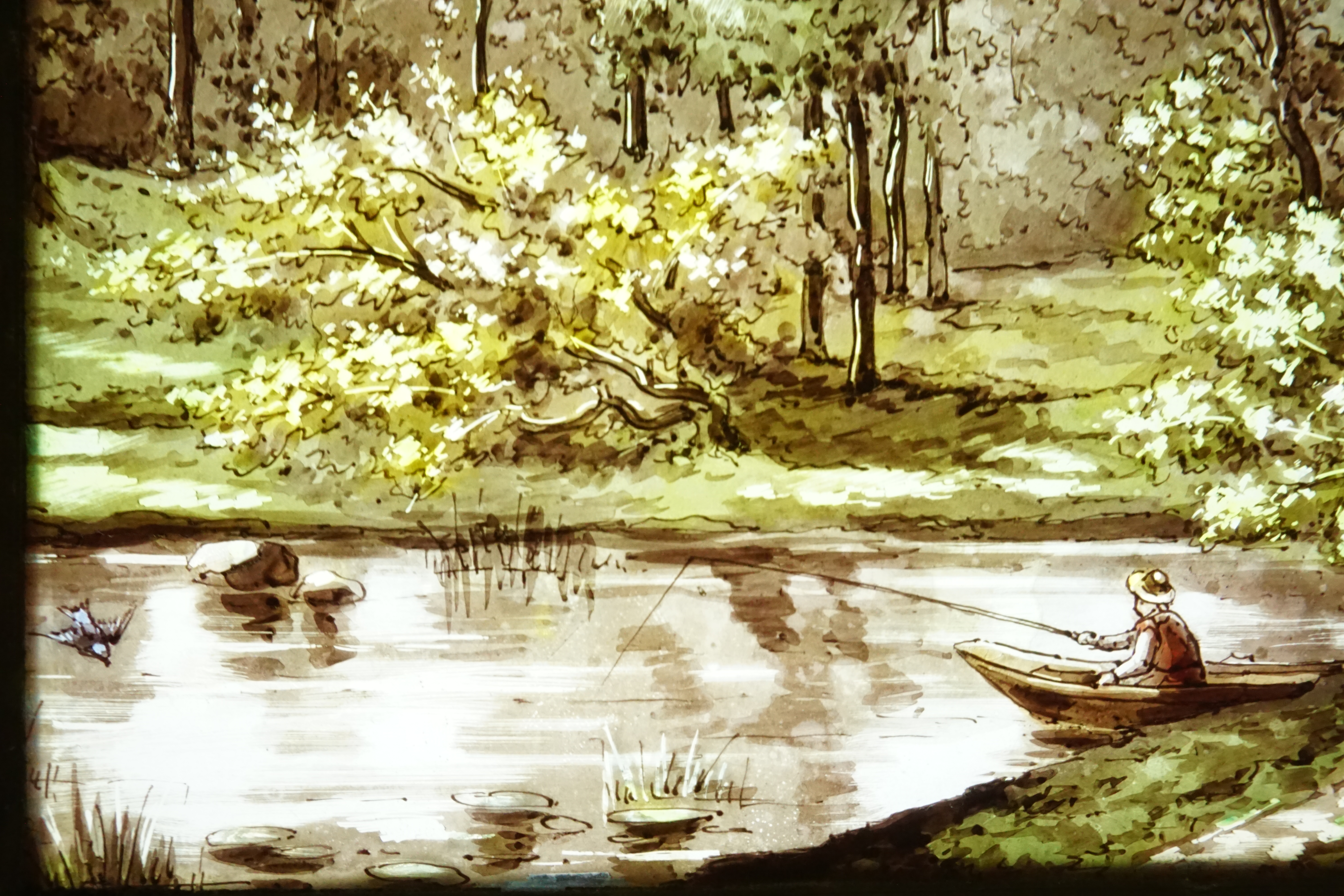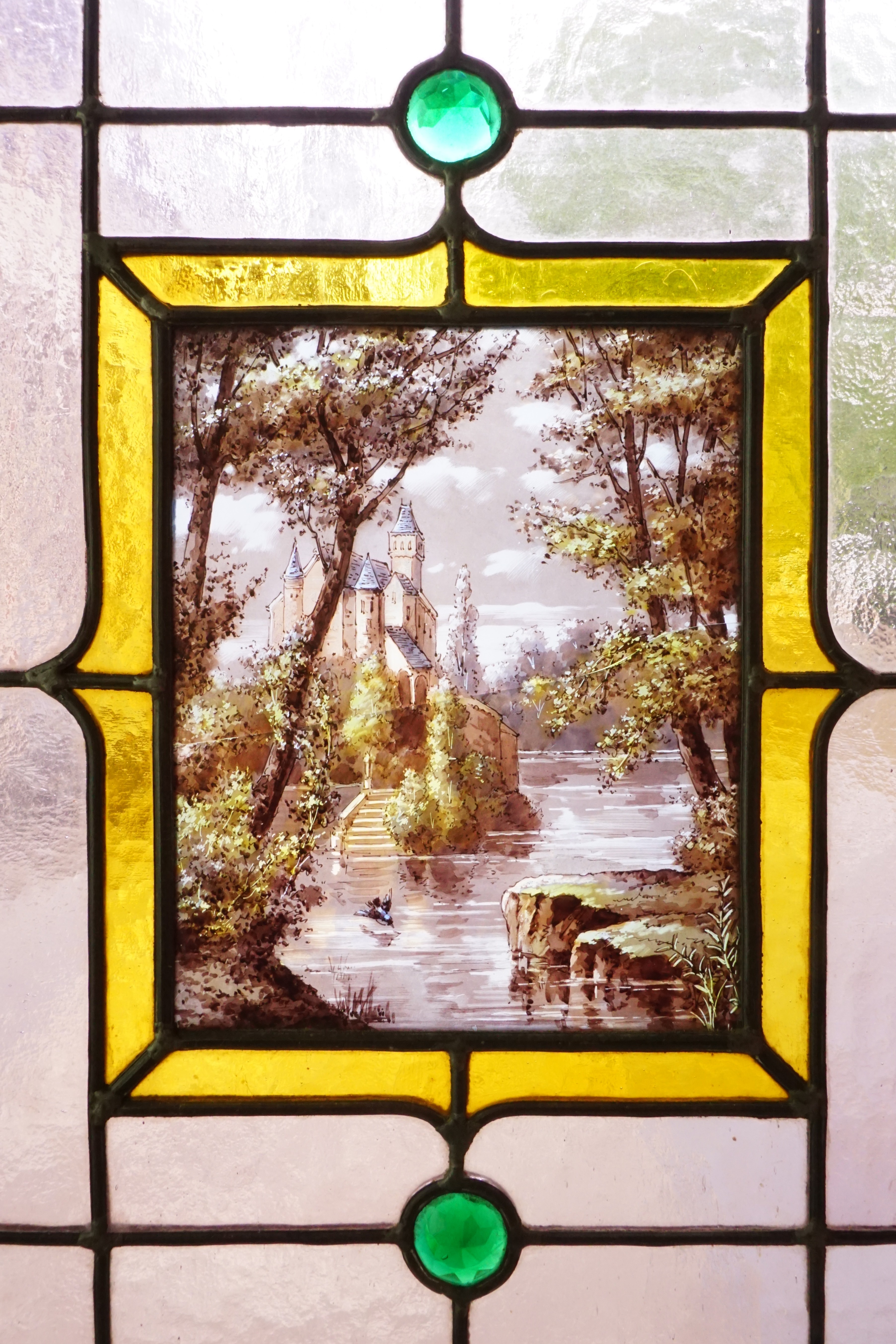 Au centre des deux panneaux centraux figurent deux paysages de bord de rivière. L’un composé d’un château et l’autre d’un pêcheur dans sa barque. Une atmosphère de calme et de sérénité se dégage de ces vitraux.