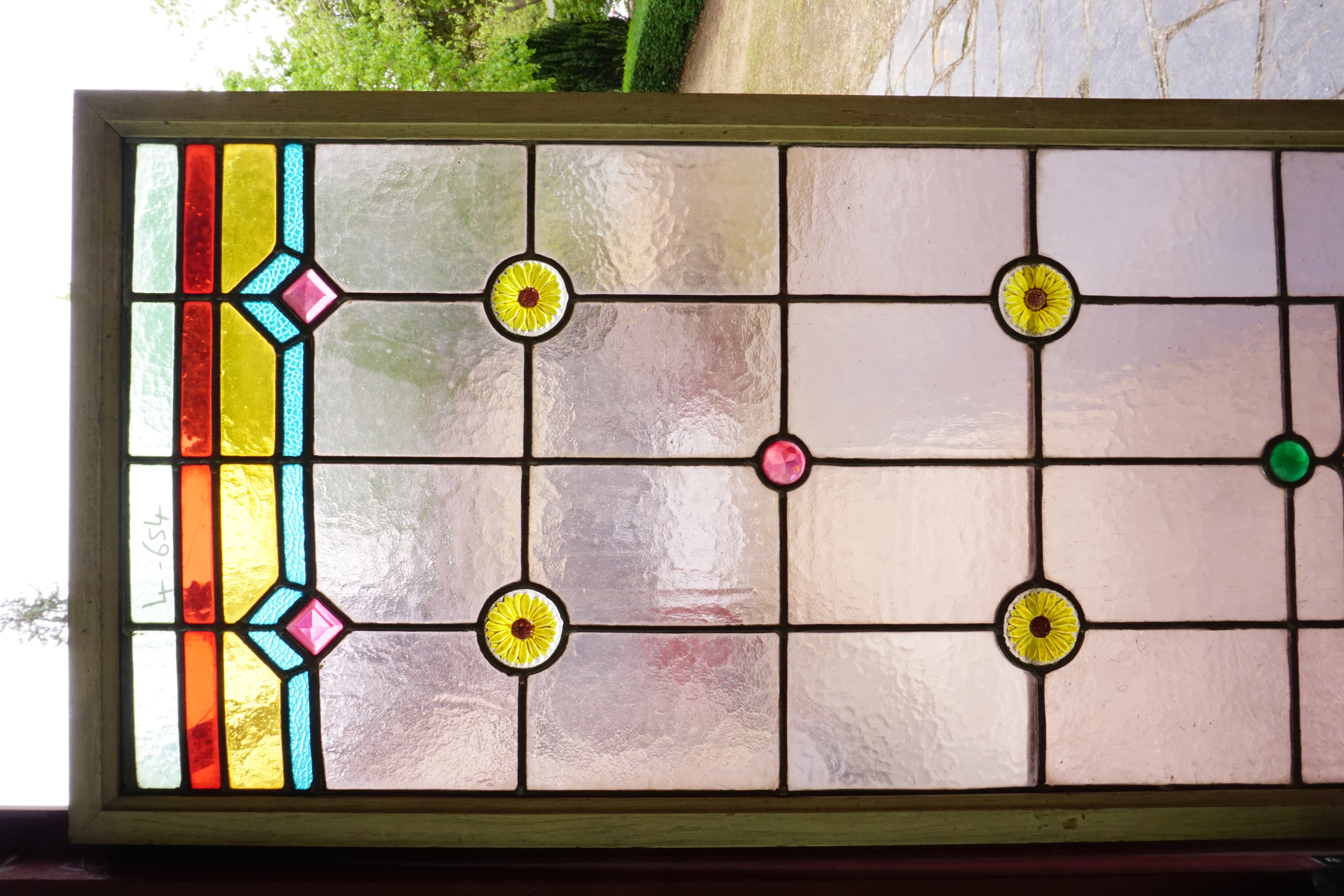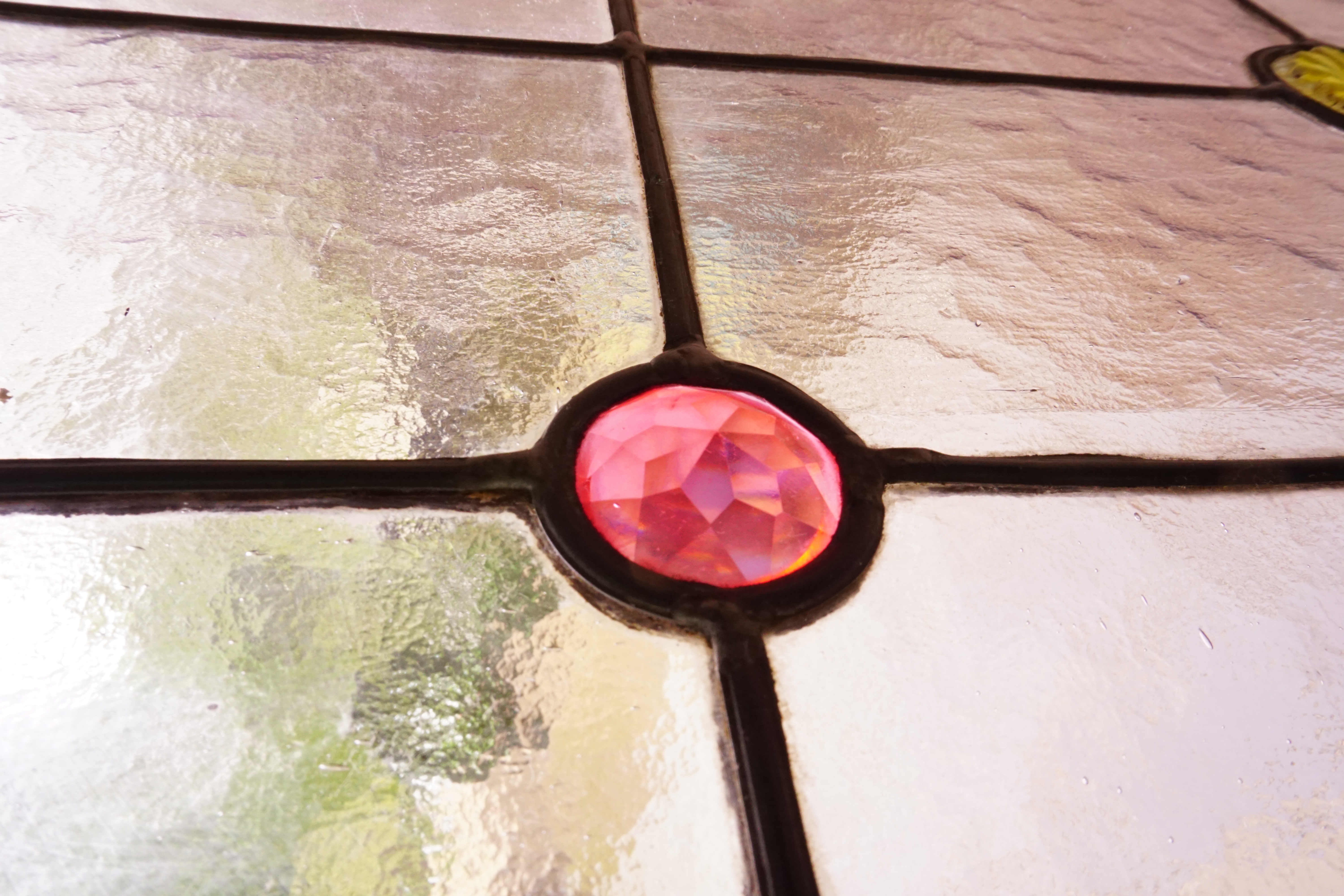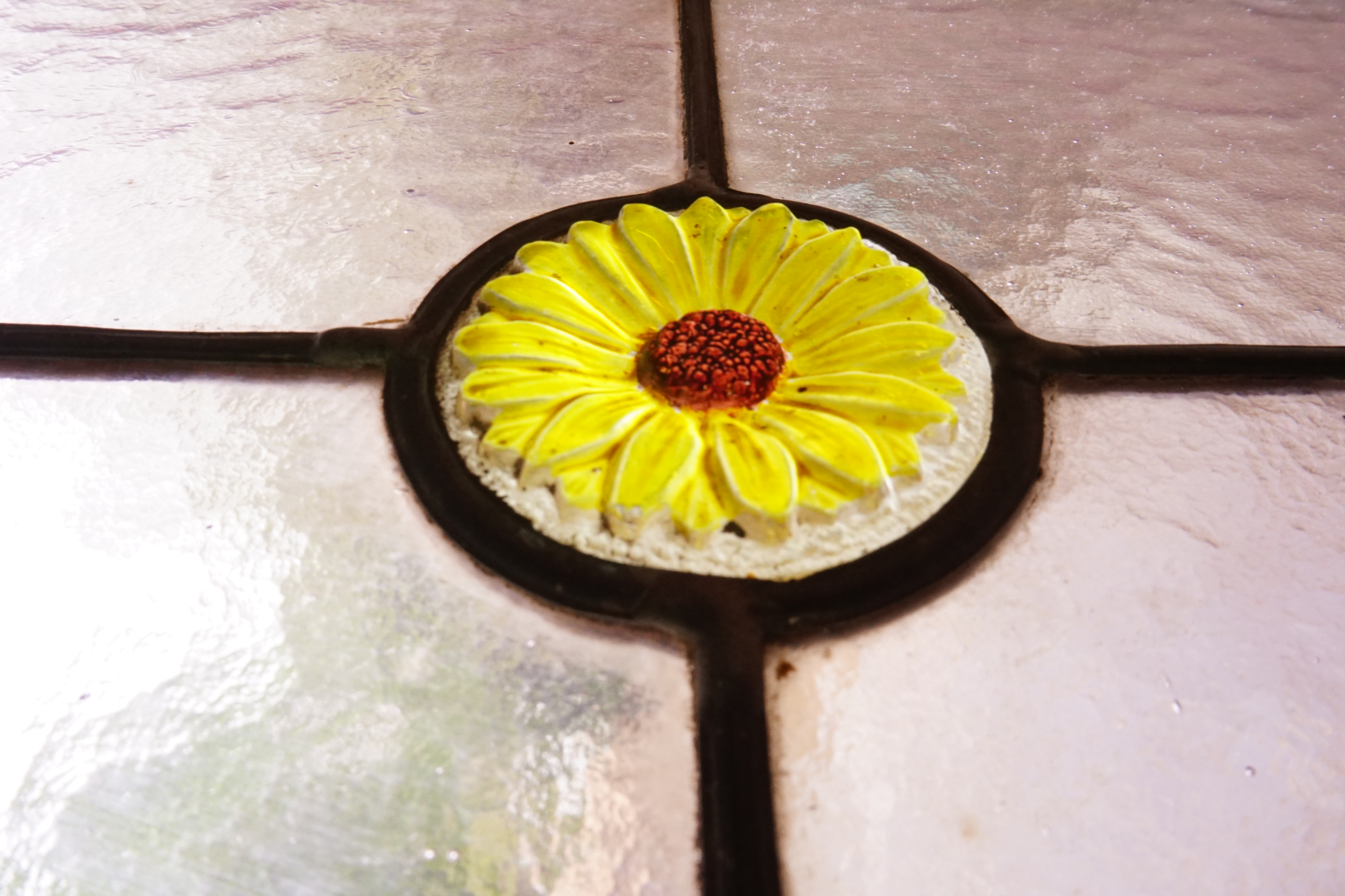 La vitrerie est en verre cathédrale d’un rose pâle, agrémentée de cabochons roses, verts et en forme de fleurs.