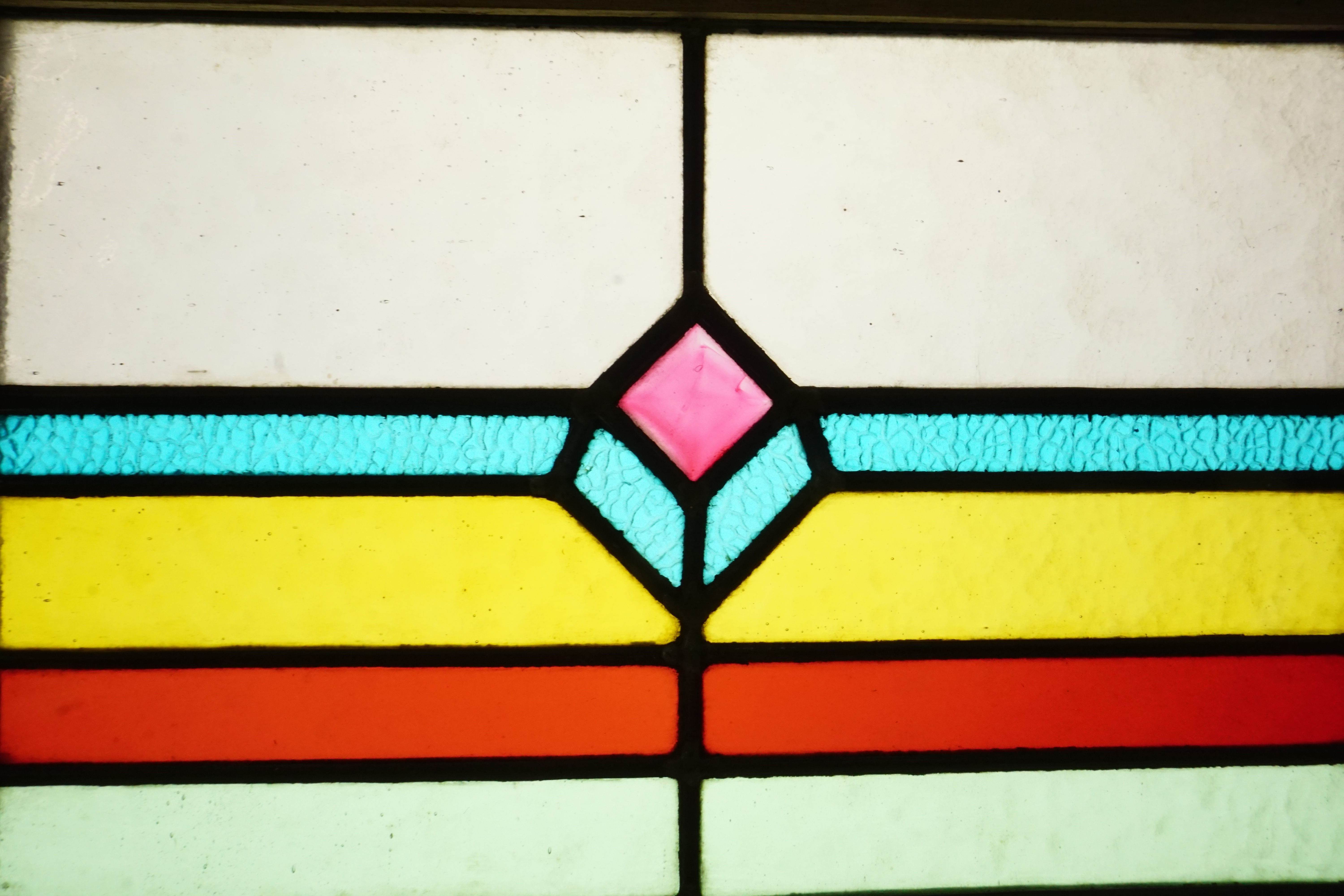 Grande vitrerie aux teintes rosées, composée en 4 panneaux.